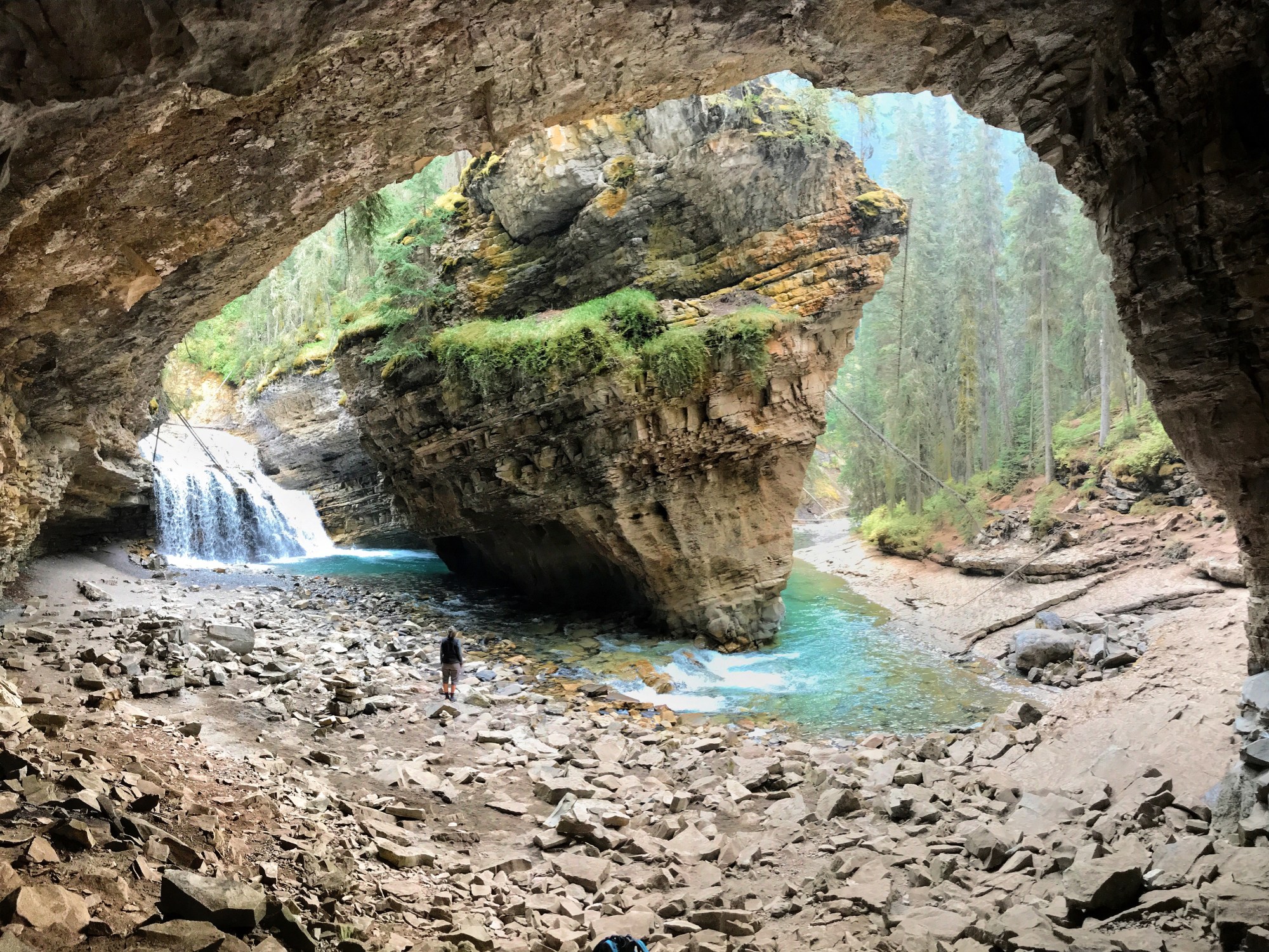 To find the not-so-hidden cave, which has become an icon of Banff– follow the trail up towards the Upper Falls. About 5-10 minutes before you get to the Upper Falls, you will see trails of footprints/openings in the trees to your right. This is how you get down to the cave. You will see the giant rock (from the picture) from above, from a viewpoint, which means you are on top of the cave, and you have gone about a minute too far!